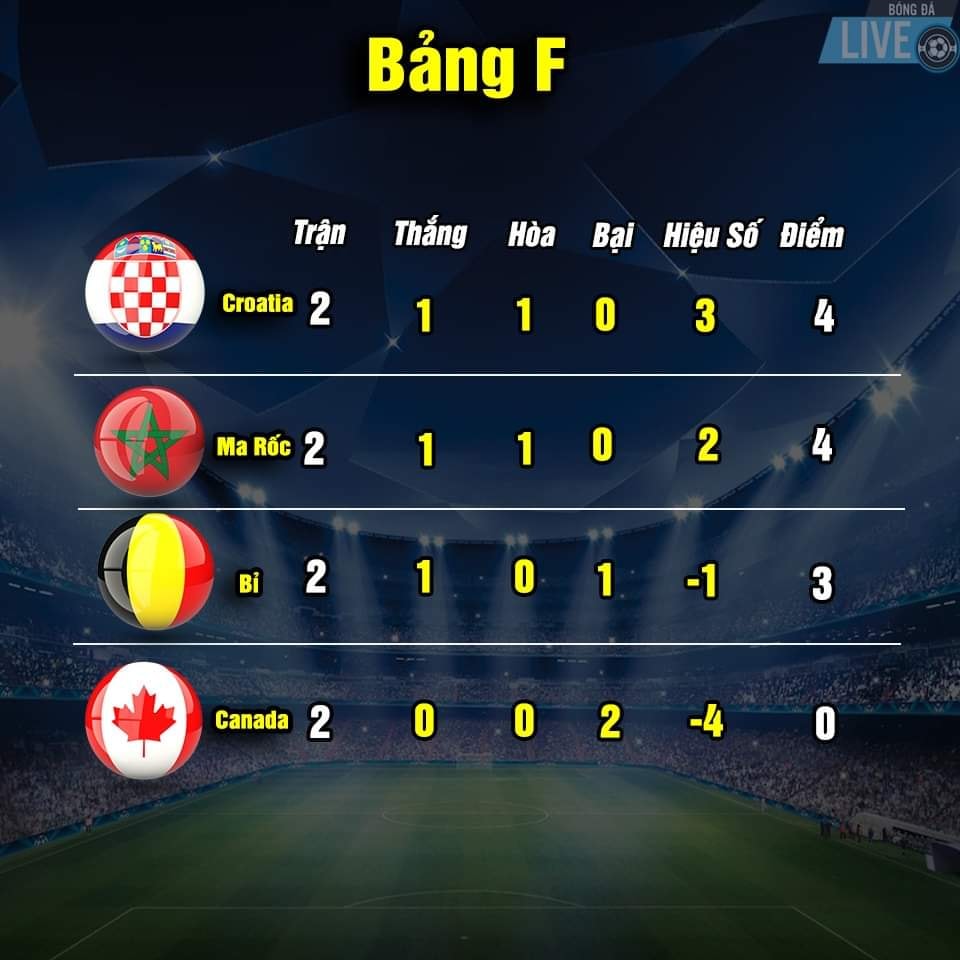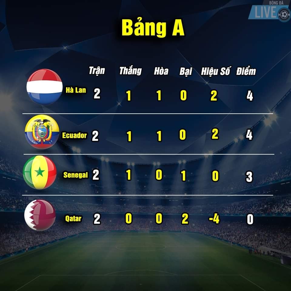 Bảng xếp hạng World Cup 2022 sau khi kết thúc trận thứ 2 vòng bảng