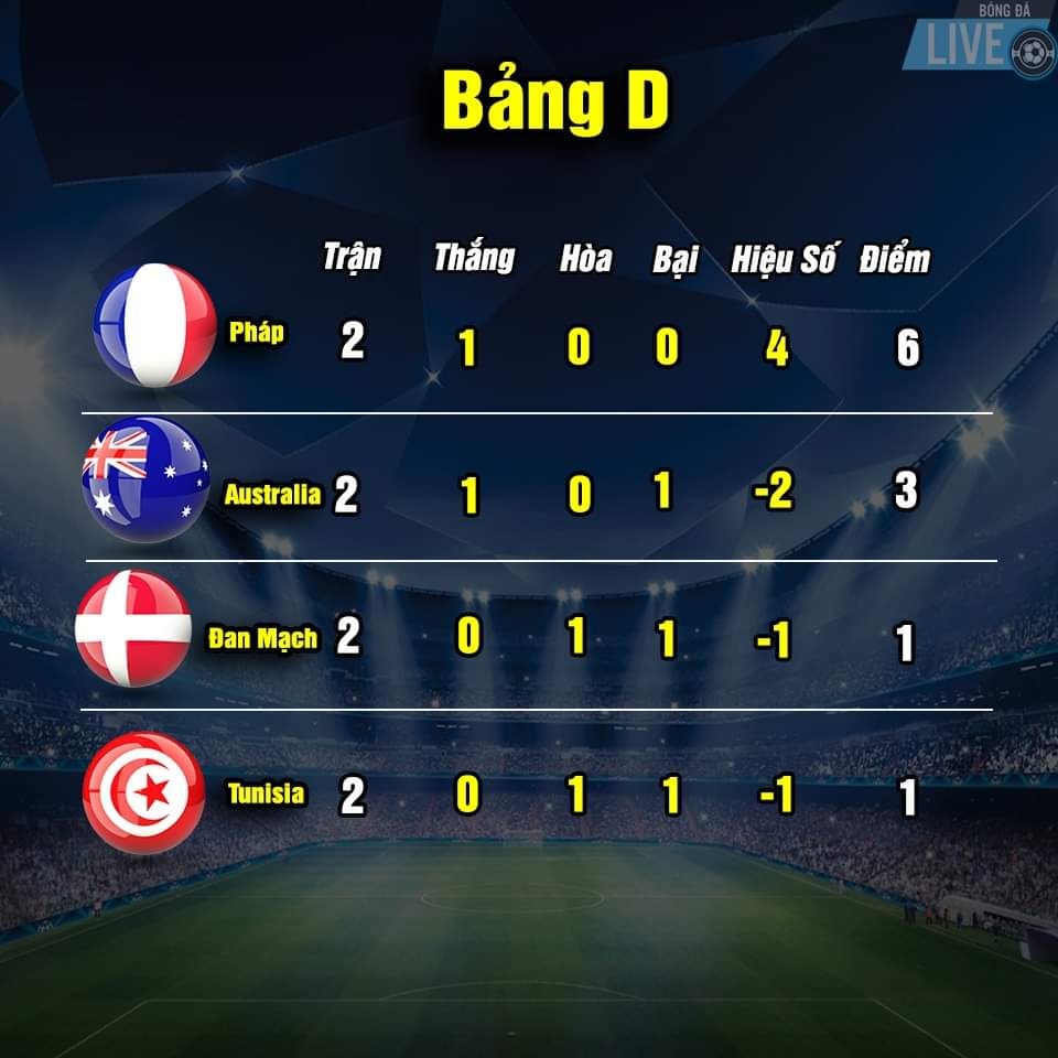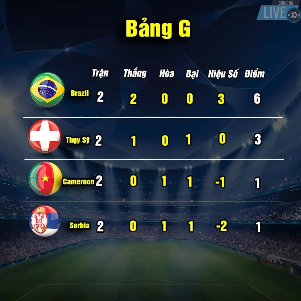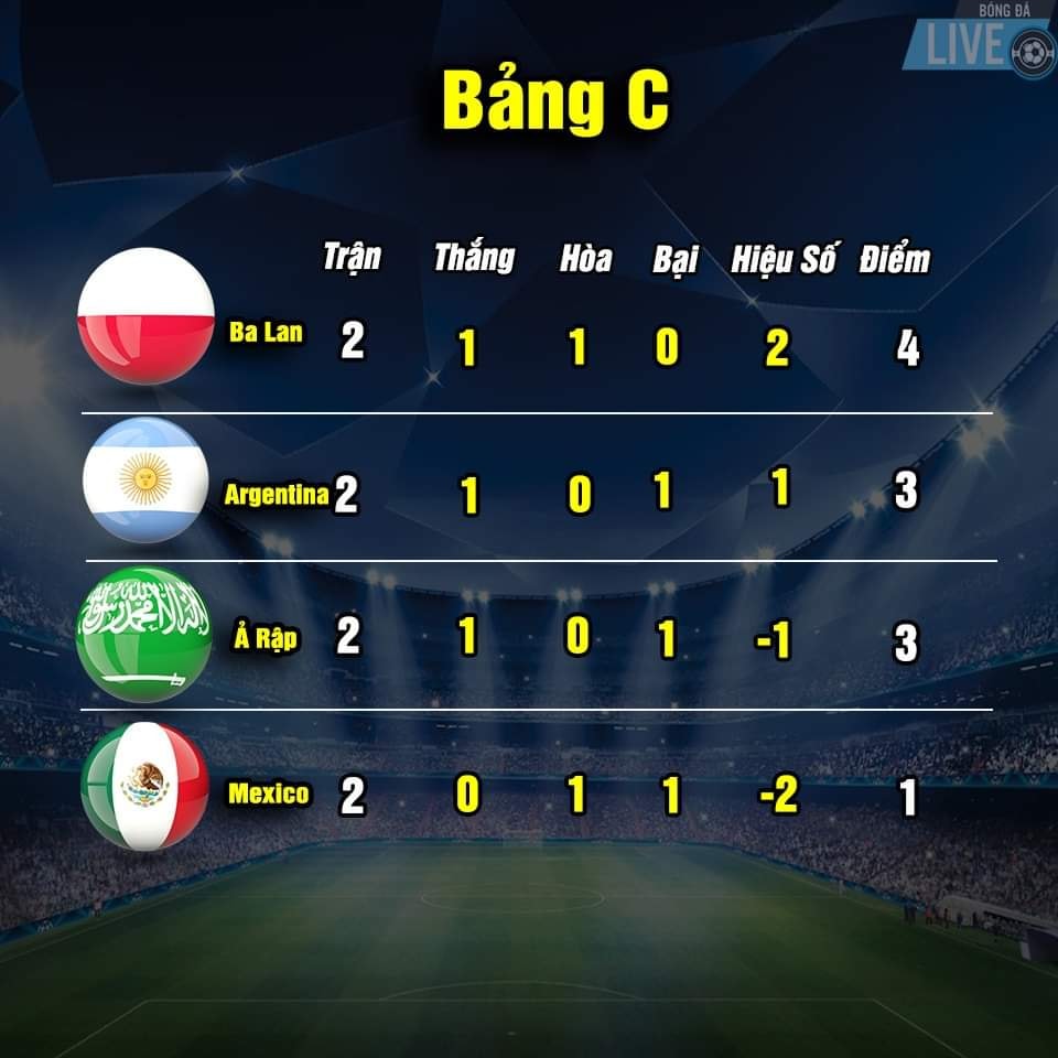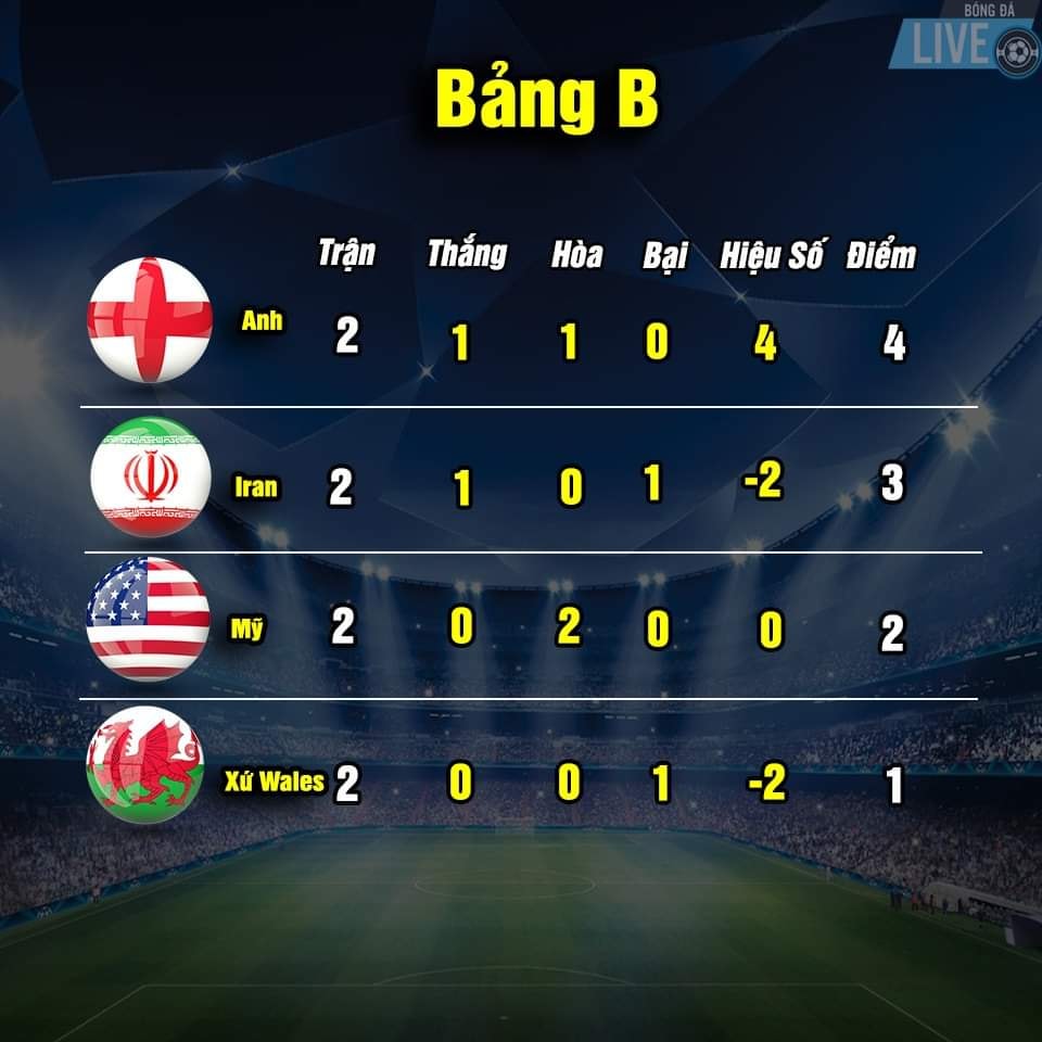 Bảng xếp hạng World Cup 2022 sau khi kết thúc trận thứ 2 lượt thi đấu vòng bảng vào ngày 28.11.2022