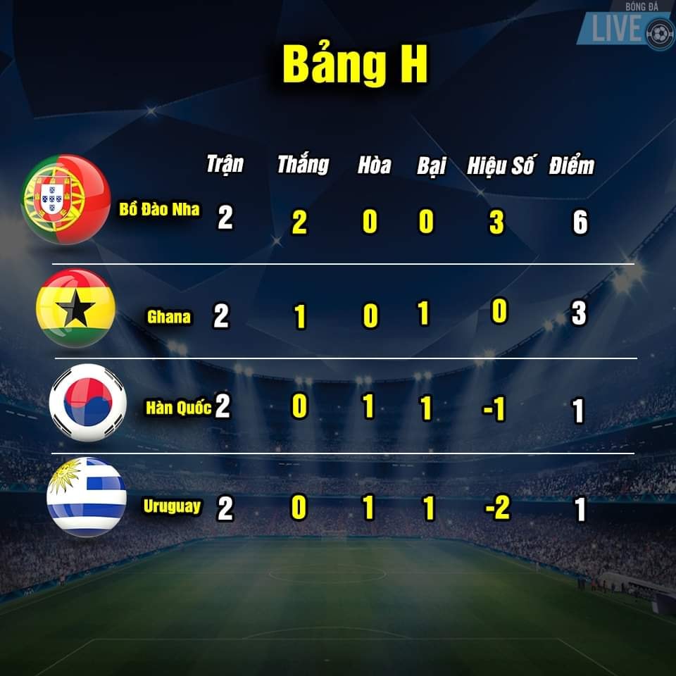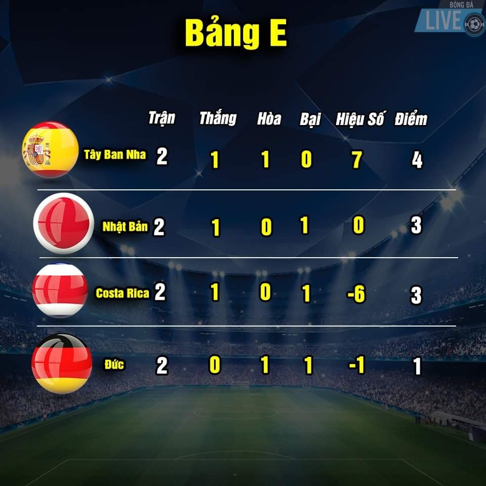 Bảng xếp hạng World Cup 2022 sau khi kết thúc trận thứ 2 lượt thi đấu vòng bảng vào ngày 28.11.2022 như sau: