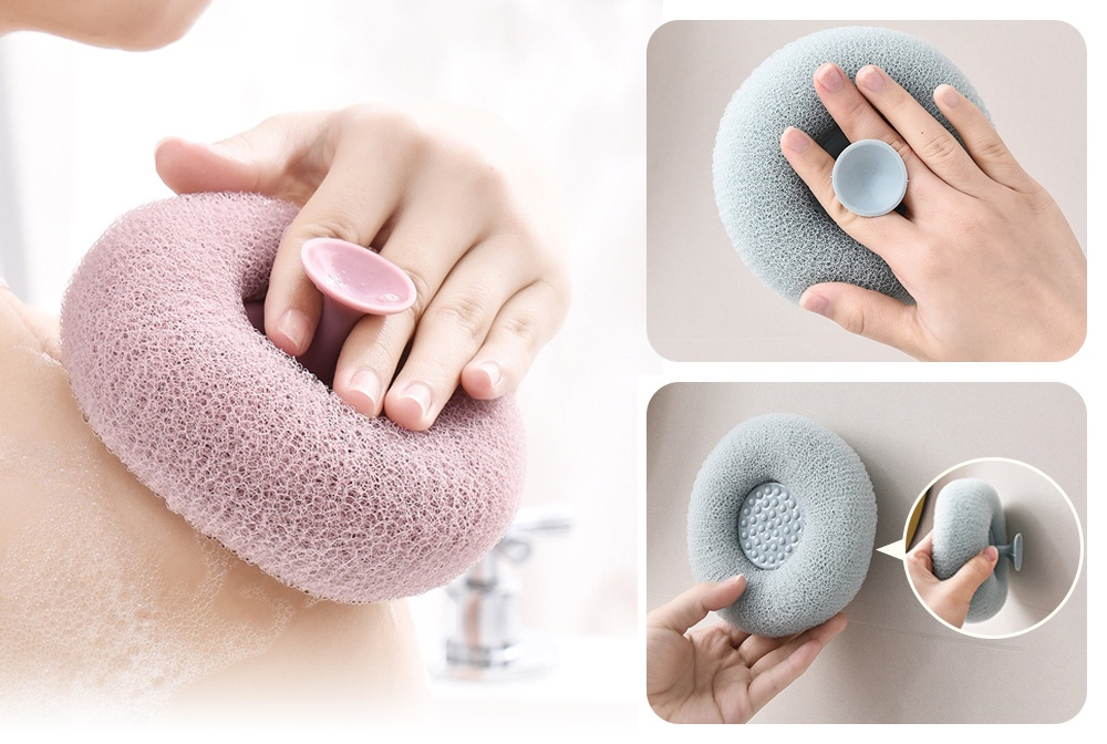 Bước 3: Sau khi kết thúc, rửa sạch bông tắm lưới và ấn giữ cố định giác hút lên mặt kính/ mặt tường gạch men để khô hoàn toàn trước khi sử dụng lần sau.