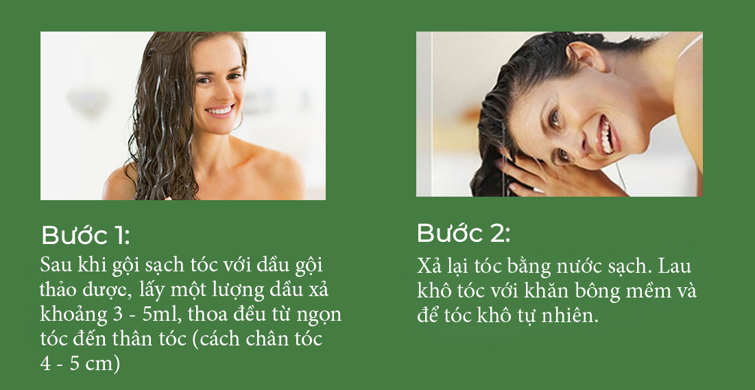 - Sau khi gội đầu, thoa đều dầu xả lên 2/3 phần tóc tính từ ngọn tóc trở lên, đặc biệt thoa nhiều ở ngọn tóc rồi dùng nón trùm ủ tóc trong 20 phút.