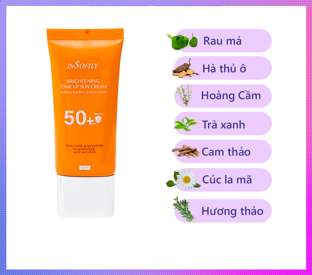 Kem chống nắng nâng tông trắng da Drsoftly Brightening Tone Up Sun Cream SPF50+ PA++++ là sản phẩm bảo vệ da vật lý, được sản xuất theo công nghệ Hàn Quốc, với công thức bổ sung các thành phần thảo dược tự nhiên, không chỉ giúp bảo vệ da khỏi ánh sáng xanh, tia UV mà còn bật tông da sáng hồng tự nhiên; Đồng thời cung cấp độ ẩm, hạn chế tình trạng mất nước do môi trường.