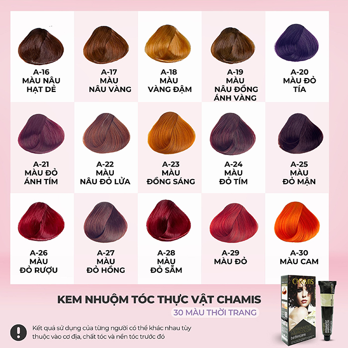 - Kem nhuộm tóc thực vật Chamis Permanent Hair Colour mang đến cho người dùng trải nghiệm nhuộm tóc chuẩn màu salon ngay tại nhà. Công thức tự nhiên, dựa trên thực vật dịu nhẹ với da đầu và tóc, màu tóc lên chuẩn đẹp, rực rỡ. Kem nhuộm bổ sung vitamin và keratin giúp hạn chế gãy rụng và bảo vệ tóc trong quá trình nhuộm. Không cần nâng nền, không cần tẩy tóc vẫn đẹp như mong muốn.