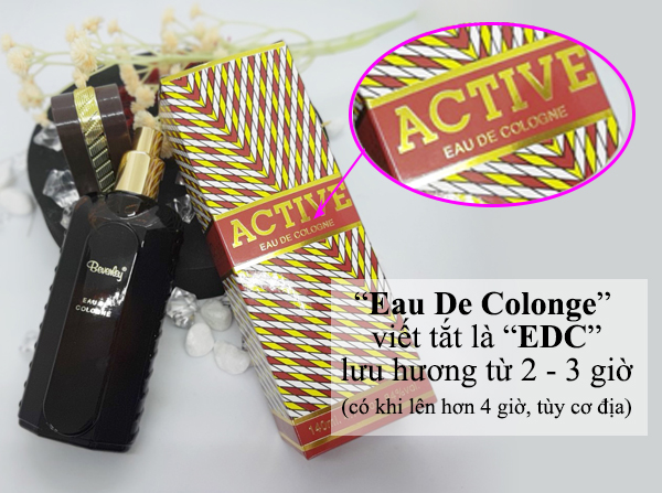 Trước đây, Eau de Cologne (EDC) hoặc viết đơn thuần là Cologne thường được dùng để chỉ các mùi hương dành cho nam giới. Ngày nay, thuật ngữ này được dùng với nghĩa rộng hơn, chỉ các mùi hương dịu nhẹ bởi chúng chỉ chứa 2 - 4% tinh chất nước hoa. Thời gian lưu hương khoảng 2 - 3 tiếng. Loại này thích hợp dùng ở nơi có khí hậu nóng. EDC được bán với dung tích lớn hơn các loại nước hoa khác với giá khá mềm.