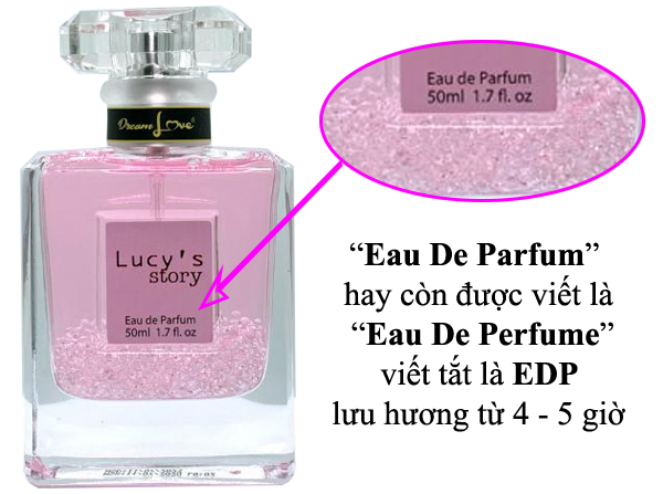 Eau De Parfum (EDP) chứa 15 - 20% tinh chất nước hoa, thời gian lưu hương đứng thứ từ 4 - 5 tiếng, có khi lên hơn 6 tiếng (tùy cơ địa), thích hợp với những hoạt động ngoài trời. Mùi hương của EDP có thể hơi nồng khi được sử dụng trong nhà hoặc trong không gian chật hẹp, đông người. Khi sử dụng EDP, một người đứng cách bạn trong một cánh tay có thể cảm nhận được mùi hương của bạn.