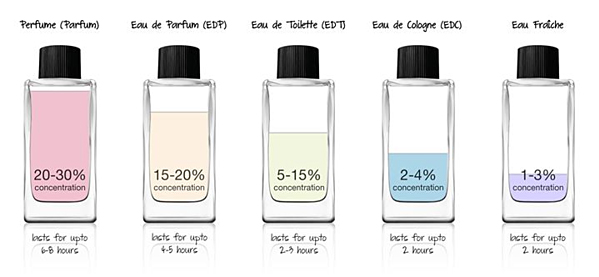 Perfume, Eau de Parfum, Eau de Toilette và Cologne, Eau Fraiche khác nhau ở tỷ lệ thành phần tinh dầu, ảnh hưởng đến khả năng lưu giữ mùi hương lên cơ thể.