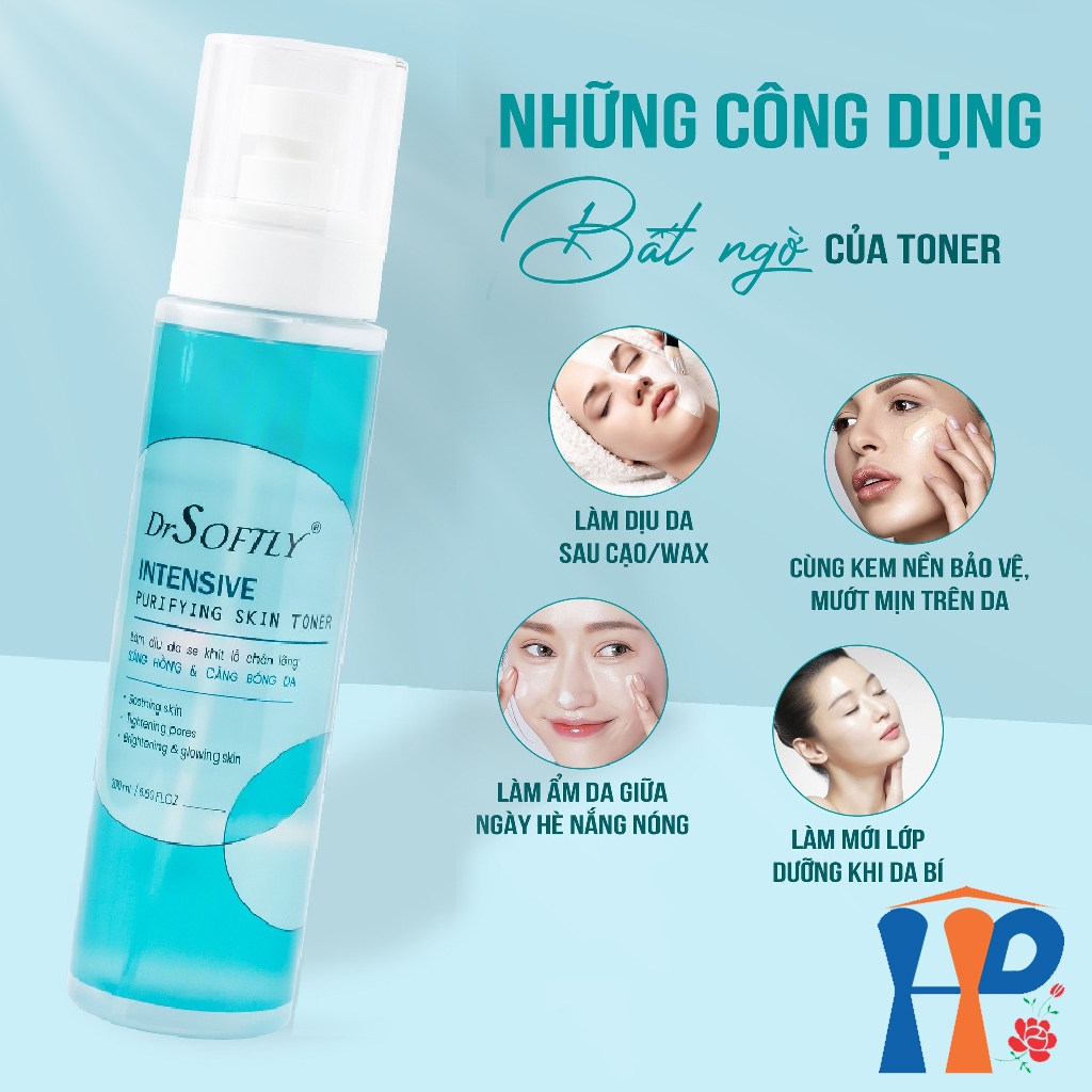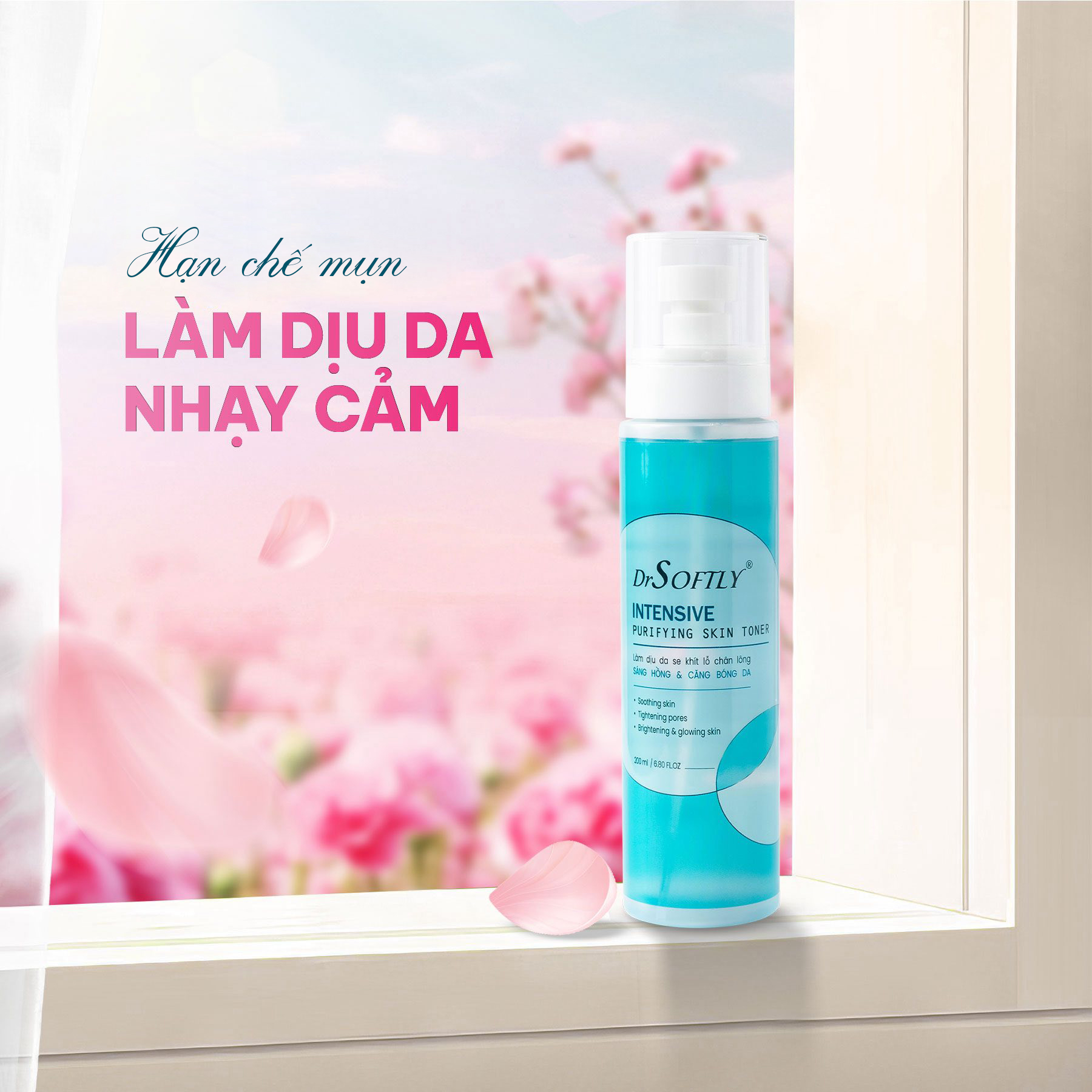 Nước hoa hồng Drsoftly Skin Toner là bước chăm sóc da không thể thiếu, giúp cân bằng độ ẩm và phục hồi làn da sau rửa mặt.