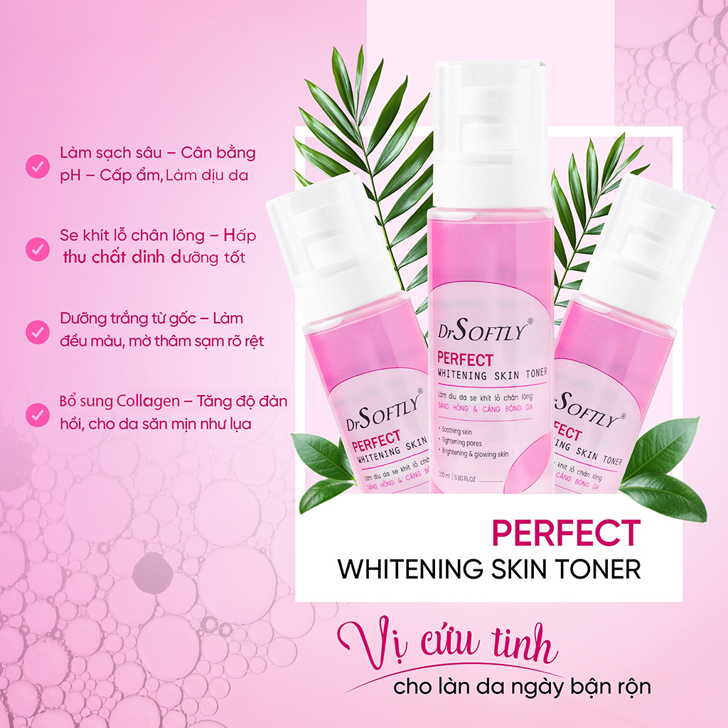 Nước hoa hồng dưỡng trắng da DrSoftly Perfect Skin Toner giúp cân bằng pH, đồng thời cung cấp hoạt chất Rhamnose tái tạo da, tăng sinh collagen, làm dịu da mệt mỏi và đẩy lùi quá trình lão hoá, giúp da đàn hồi, căng mướt, hỗ trợ hấp thu các dưỡng chất trong các bước dưỡng da tiếp theo nhanh gấp nhiều lần so với sản phẩm thông thường, nâng tông da trắng sáng, đều màu.
