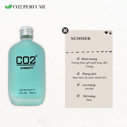- Với hương thơm của nước hoa CO2 Summer khi lan tỏa ra xung quanh, sẽ chinh phục mọi không gian bằng sức hút tinh tế. Hương thơm của Summer gợi lên sự tươi mới của một làn gió mát trong mùa hè oi ả.