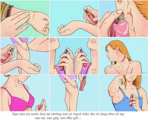 - Mở nắp chai tinh dầu nước hoa theo chiều từ trái sang phải, chấm tinh dầu lên vùng da ít lỗ chân lông (như sau tai, gáy, yết hầu và hai cổ tay)