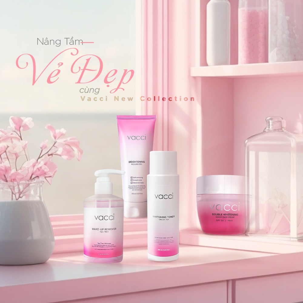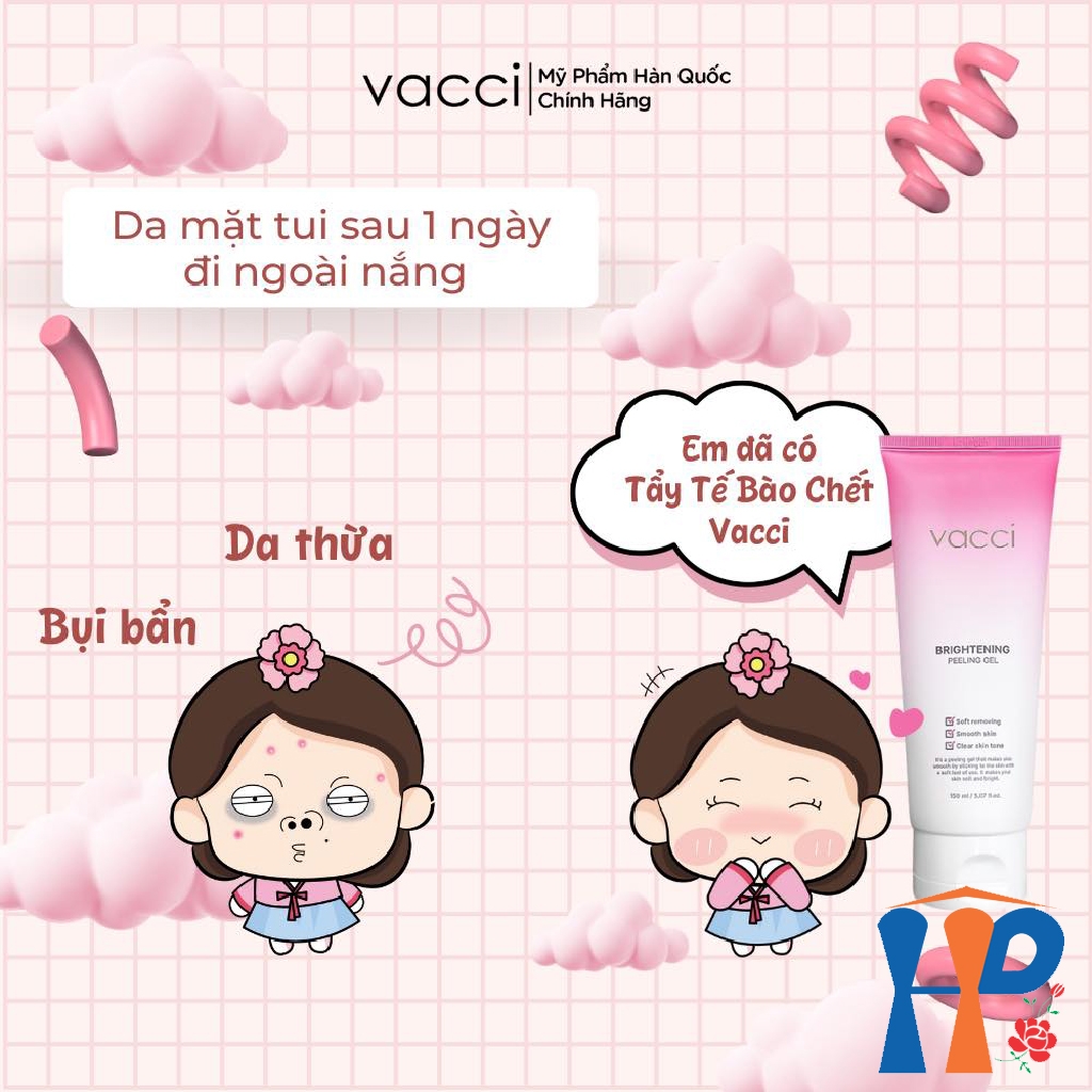 - TẨY TẾ BÀO CHẾT VACCI chứa chiết xuất thảo dược, vitamin C, E và cenlulo tác động sâu vào lỗ chân lông, nhẹ nhàng lấy đi các chất bẩn, lớp tế bào chết, mụn cám, mụn đầu đen.... Làn da sẽ trở nên trắng sáng, căng khỏe và mịn màng hơn sau khi sử dụng.